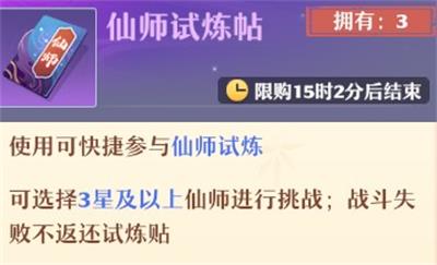 仙师试炼帖,可以直接召唤3星及以上的专属仙师。价格30元宝/张,每天限购3张!另外还可以通过中午12点和傍晚18点的灵脉奖励中概率获得。