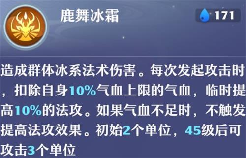 技能设置上,寒霜仙鹿拥有特殊的主动法系技能,每次施放技能时需要扣除自身10%气血上限的气血,来提高10%的法功,如果气血不足就不会获得这个临时增益效果。几个细节: