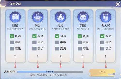 4、我们以华府为例,每个仙府都将拥有【卧室】、【厨房】、【丹房】、【宠室】和【佣人房】,而选择户型时的空间分配即可以用来选择每个建筑的等级。其中每个建筑的普通级都将消耗2点空间,中级消耗6点,高级消耗12点。
