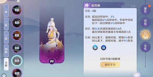 2、其次,每一张幻形符无论品阶,都拥有强和弱两种元素属性,相同属性的幻形符,强会克制弱。比如封系门派经常使用的五阶幻形符青铜兽,便是强电、弱冰属性,如果遇到对方使用了强冰、弱水的绘咒师幻形符,此时青铜兽的弱冰便会被绘咒师的强冰克制,前者仙友的伤害会降低5%,而后者仙友伤害则会提高5%。此克制关系只作用于使用幻形符的对象,对于没有使用幻形符的玩家无效。