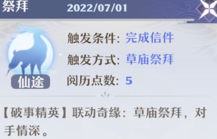 4.之后则是官方早期给出的线索奇缘夜雨,完成祭拜后雨天前往比马瘟之墓祭拜后即可触发夜雨奇缘。