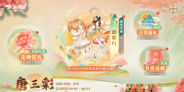 骏马踏春寻知音,三彩一曲庆花朝!为了让盛唐风范再次重现神州,全新福利活动“踏歌行”登场!全新萌宠唐三彩惊喜登场,登录就送!3月7日维护后至4月3日0点,唐三彩养成活动“踏歌行”限时开启,达成活动进度即可免费获得全新观赏「坐骑·五花马」,和唐三彩一起丝路寻乡!节日属性玩法“花纹锦绣”开启,参与各类节日活动即可收集花纹锦绣,它将为你提供限时属性加成,对战怪物更轻松!