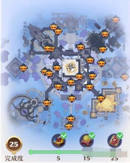 1、梦幻新诛仙倒悬城探灵位置如下,一共有25个:
