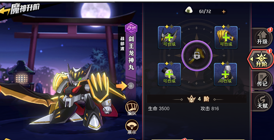 魔神升阶可通过关卡掉落的素材进行装备合成,装备满格即可进阶,阶级越高、对生命及攻击的加成越大