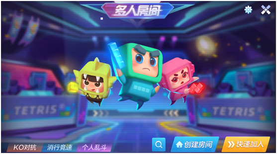 除此以外,方块超人们还能加入多人房间,六人对战,畅享竞技乐趣!多人房间功能提供KO对抗、消行竞速、个人乱斗三种模式可供创建,邀请好友尽情“打块开黑”,也可快速加入已有的房间,在对战中相知相识!