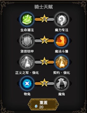 由于贞德需要站场,普攻输出为其主要输出手段,所以天赋点生命,想要增加输出的话可以点魔力专注,其余的点主要看环境。如果打魔法职业输出较多的副本,加魔法斗篷和魔免,物理则相反。第三天赋的正义之军-强化可以强化贞德的大招增伤效果,契约-强化的的效果则可以有效地增加队友的站场能力。一波流玩家可以选择前者,车轮战玩家可以选择后者。