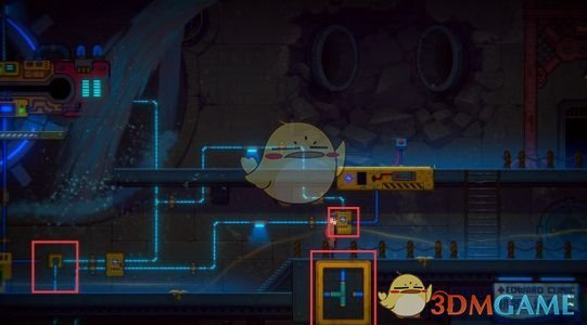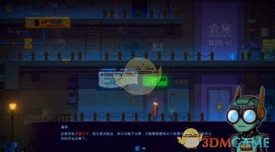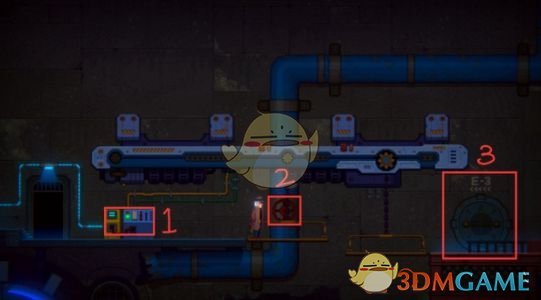 电流接通后,启动下图的控制台【1】,升降台会抬起,把升降台上的红色阀门【2】转动,引出水流。可以顺路进入最右侧【3】的E-3门中获得【遗落的机器人笔记】。