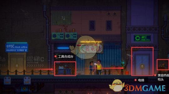 我们到达了花夜下町,一路往右跑,路过工作台,待会儿拿到东西后可以在这里合成,在右边拿到【美容热熔枪头】。