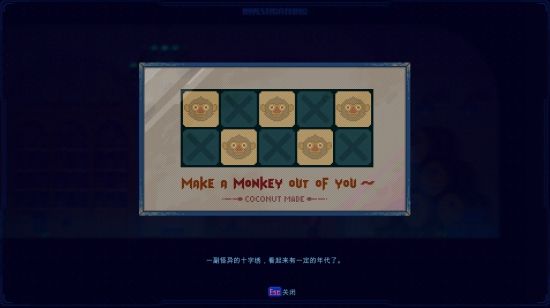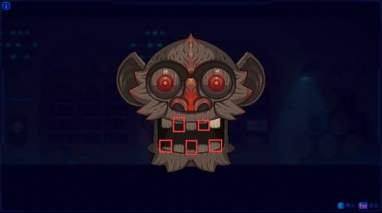 然后交互左边墙上的猴子面具,出现小游戏。这个游戏需要我们把猴子的牙齿按下,参照刚才看到的十字绣,把带叉的对应的牙齿按下去。