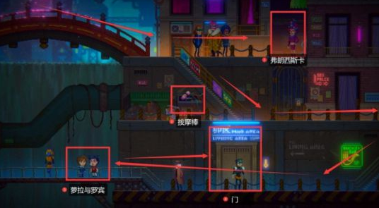 沿下图路线一路走来,拿到垃圾堆上的【按摩棒】(恶趣味~),最底层向左走会遇见之前的两个小孩,萝拉和罗宾,萝拉会把你被偷的包还给你,这样就拿回了白色通行卡。然后从右边写有“卯区”的白门进入。