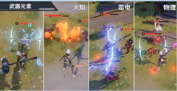 武器有火焰、寒冰、雷电、物理四种不同的属性。使用以上元素的武器攻击对人,会对敌人造成冰冻、燃烧、短路以及重伤等效果,进一步提升输出能力。