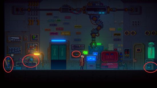 来到最左侧红圈获得【撬杆】,红圈处桌子上获得【改造中的漩涡引擎】,中间红圈处获得【激光枪火控器】右侧红圈处获取【蓄电器】。