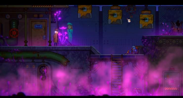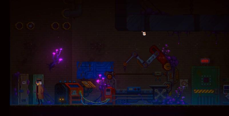 下来之后往右边走触发剧情,爬下楼梯通过跳箱子往右边走。查看中破损的机器。往左走来到阀门阀门旁边的门里面。