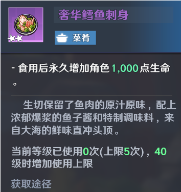 NPC直接购买的料理效果并不是很好,不足以支持玩家到后期地区和副本。所以要自己搜集食材,制作料理常备。笔者发现有些紫色料理还能够永久提升角色属性,有服用次数上限。