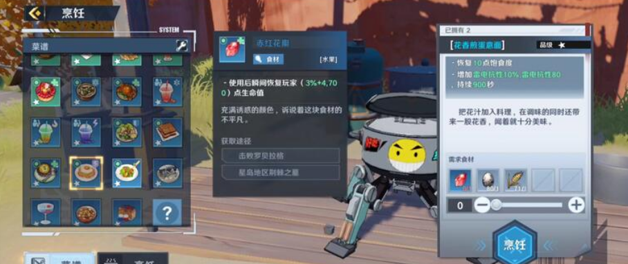 烹饪这个料理的配方为:1赤红花瓣+1禽类的蛋+1霍米基麦
