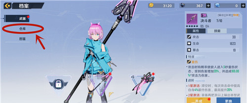 首先在武器主界面中,点击左侧栏位的【仓库】按钮。