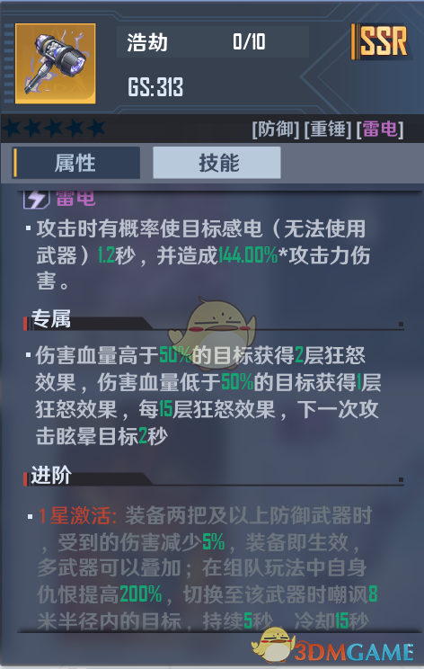优点:引怪神器,目前T必带装备,控制效果也很不错,虽然攻击动作慢,但是伤害还是可以的。二段跳击需要耐力,伤害也可观,技能适合使用闪避,触发幻时。