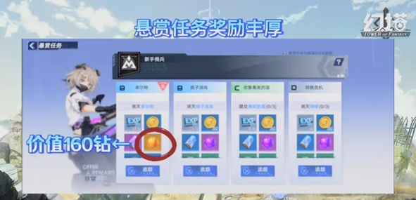 首先第一天的剧情一定要做完。做完就会解锁游戏的每日任务,每日任务奖励为一发武器池的抽卡道具,也就是160钻石。
