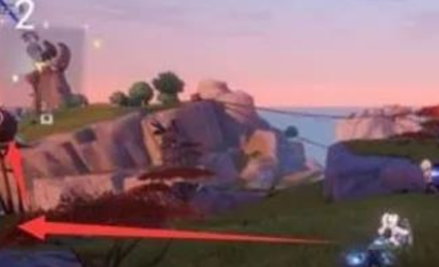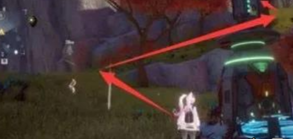 1.步骤一:首先来到折跃门-七日之森南部,朝着箭头向北部的山坡上去,如下图所示。