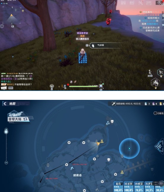 第一个在悯雨岛,我们传送的时候走过来路上有土豆,赤米,可可果,然后中间这一段可以飞上去拿榛子,这些路上顺便捡一点就够了,然后我们到图上的这个点位,有三棵气球果树,画面远一点的地方也要三棵。