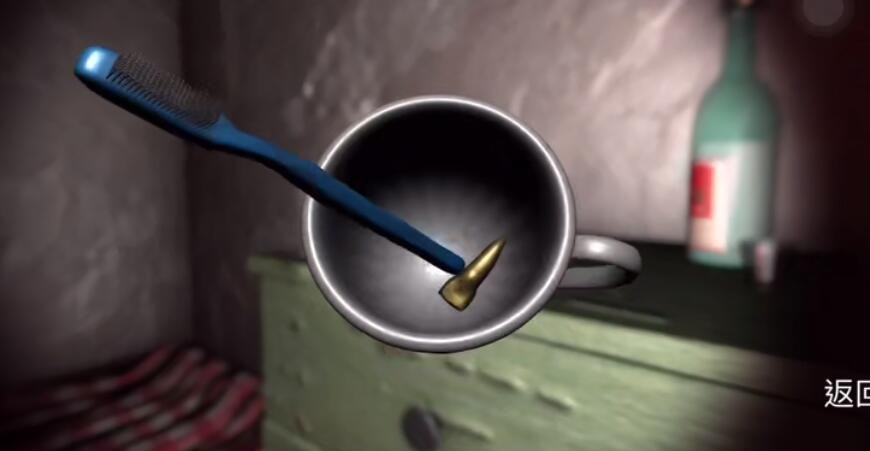 位置:进入太平间之后,走到位于地铺旁边的柜子处。点击柜子上的牙缸进入特写镜头,随后自动获取线索。