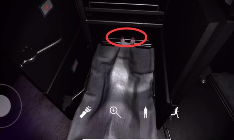 位置:将电箱断电后,将此位置的冷柜拉出来。查看尸体的脚部获取线索。
