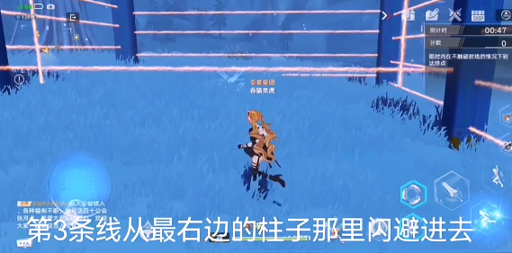 4、第三条线从最右边的柱子那里闪避进去,走过去也行,趁激光往回弹的时候过去就好