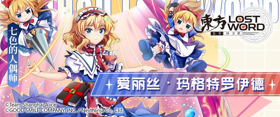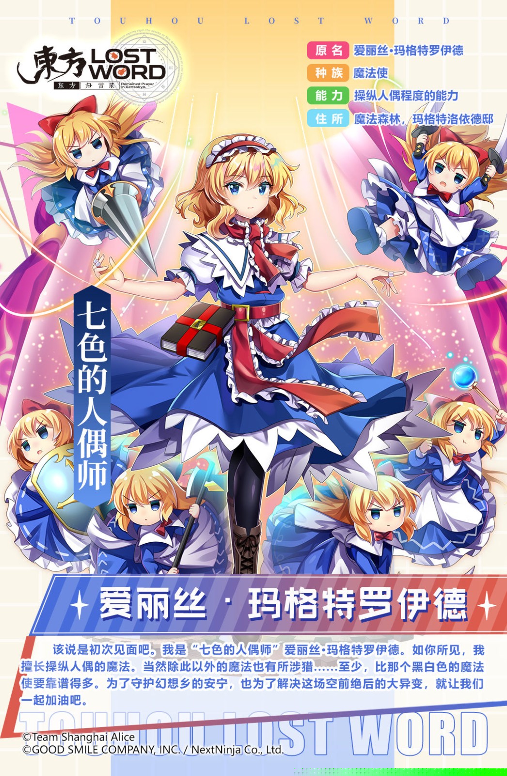 该说是初次见面吧。我是《七色的人偶师》爱丽丝·玛格特罗伊德。如你所见,我擅长操纵人偶的魔法。当然除此以外的魔法也有所涉猎......至少,比那个黑白色的魔法使要靠谱得多。为了守护幻想乡的安宁,也为了解决这场空前绝后的大异变,就让我们一起加油吧。