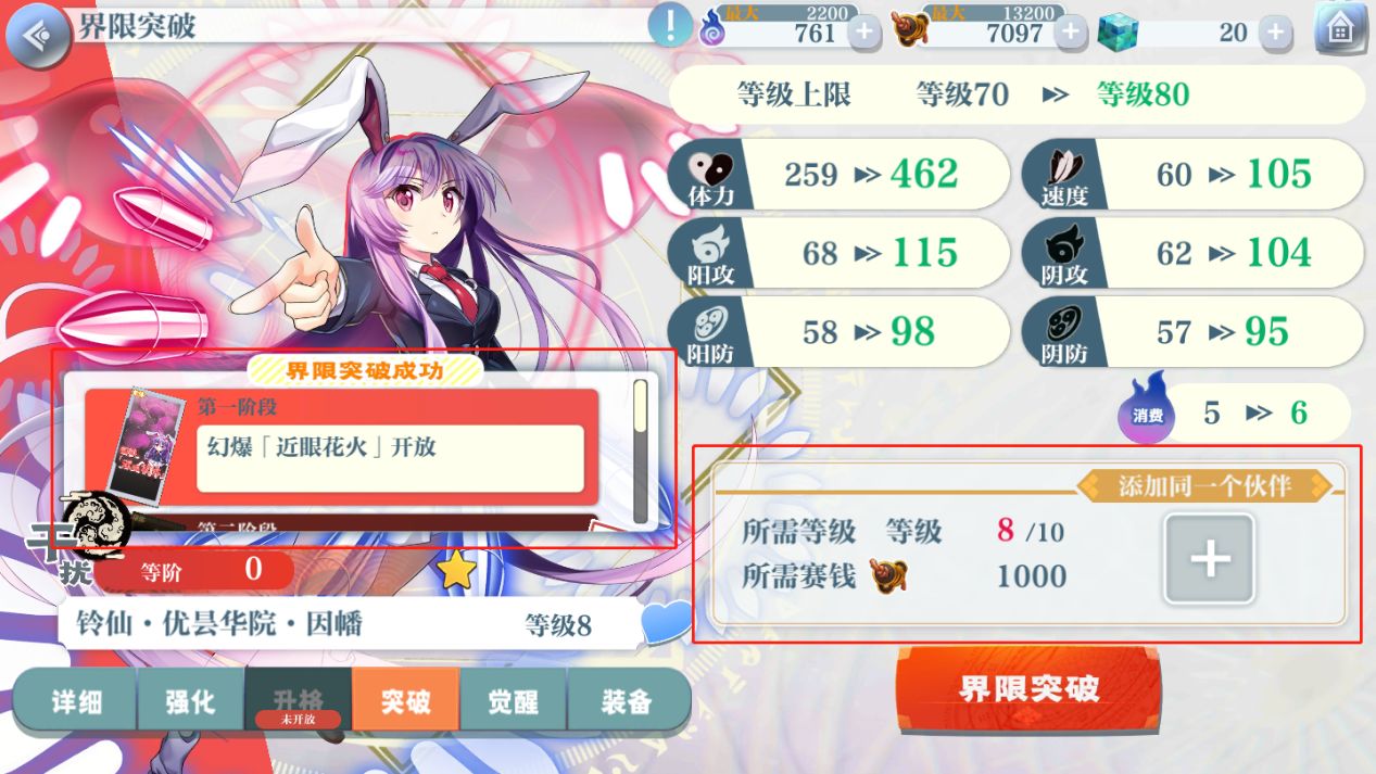 突破:当角色达到指定等级之后,可以通过消耗同一角色进行突破,突破会增加等级上限,同时解锁新符卡,当突破两次之后第三次会开启LW极意符卡。
