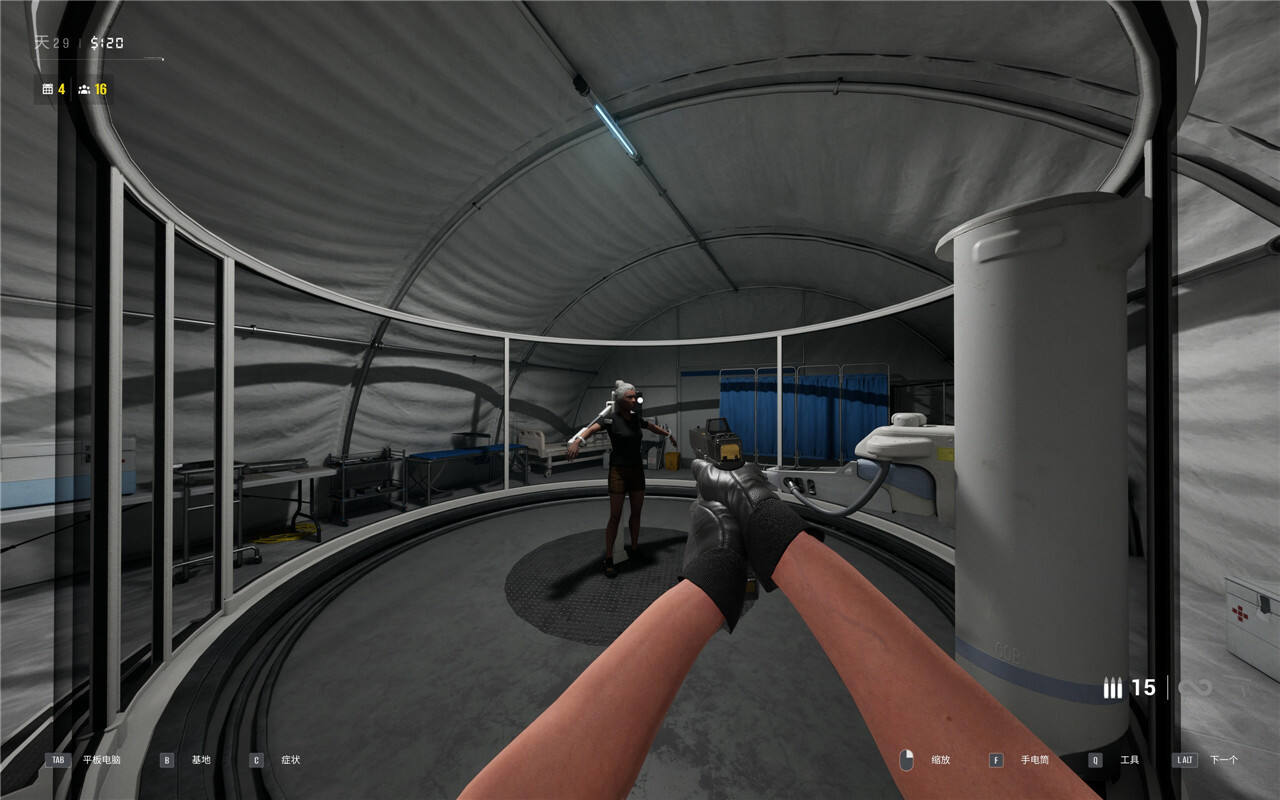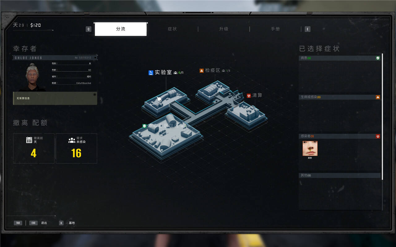 解锁实验室以后,我们随机选取一位“幸运儿”,如果你是在玩剧情模式,建议选一个已经非常确定是感染者的人,比如我们这次的人选就出现了明显的“鼻脓”的感染症状,刚好拿她开刀。