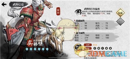 拥有极高的面板,但基本作用是起到“吴国buff”光环的作用,“东吴体系”阵容必带,不然直接缺少较多的光环属性,同蜀国刘备、魏国曹操是一样的光环定位。