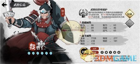 截止现在为游戏内盾防角色第一,优秀的面板加上出色的减伤承伤的战法技能,从来不秀其他的花花套路,搭配治疗谋士武将持续回血,使得一盾无敌在此承接四方伤害,超强。