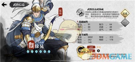 “弓队”强力挂件之一,受阵营、站位限制,但总体上还是一流的弓箭手武将,介于四星到五星之间(4.5星)。