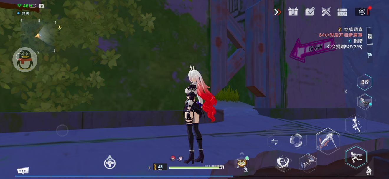 然后,就你能看到一个紫色的剪头。看到了吗!看到了吧!毕竟它这么大!到里面去!斯托克就在里面,我人物比较高给蹲着进。蹲下按钮在设置的第一页最后,自己去翻翻。