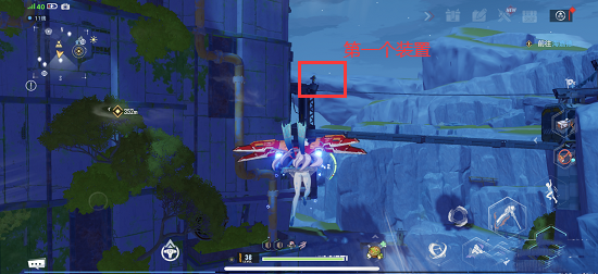 3、然后飞到对面的建筑物上,第一个启动的装置就在那里,玩家启动之后会有一道蓝色的射线,之后会显示超载变成红色,不用管他