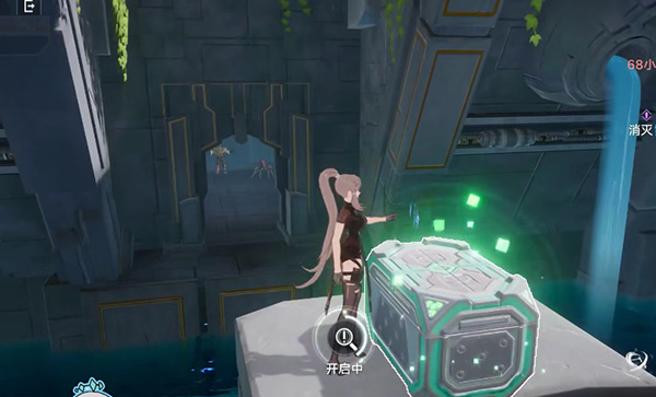 第一个宝箱就在第一个房间水池中间的高台上,进入遗迹之后在水池边等平台过来,然后利用移动平台跳上去,到中间高台上拿宝箱。