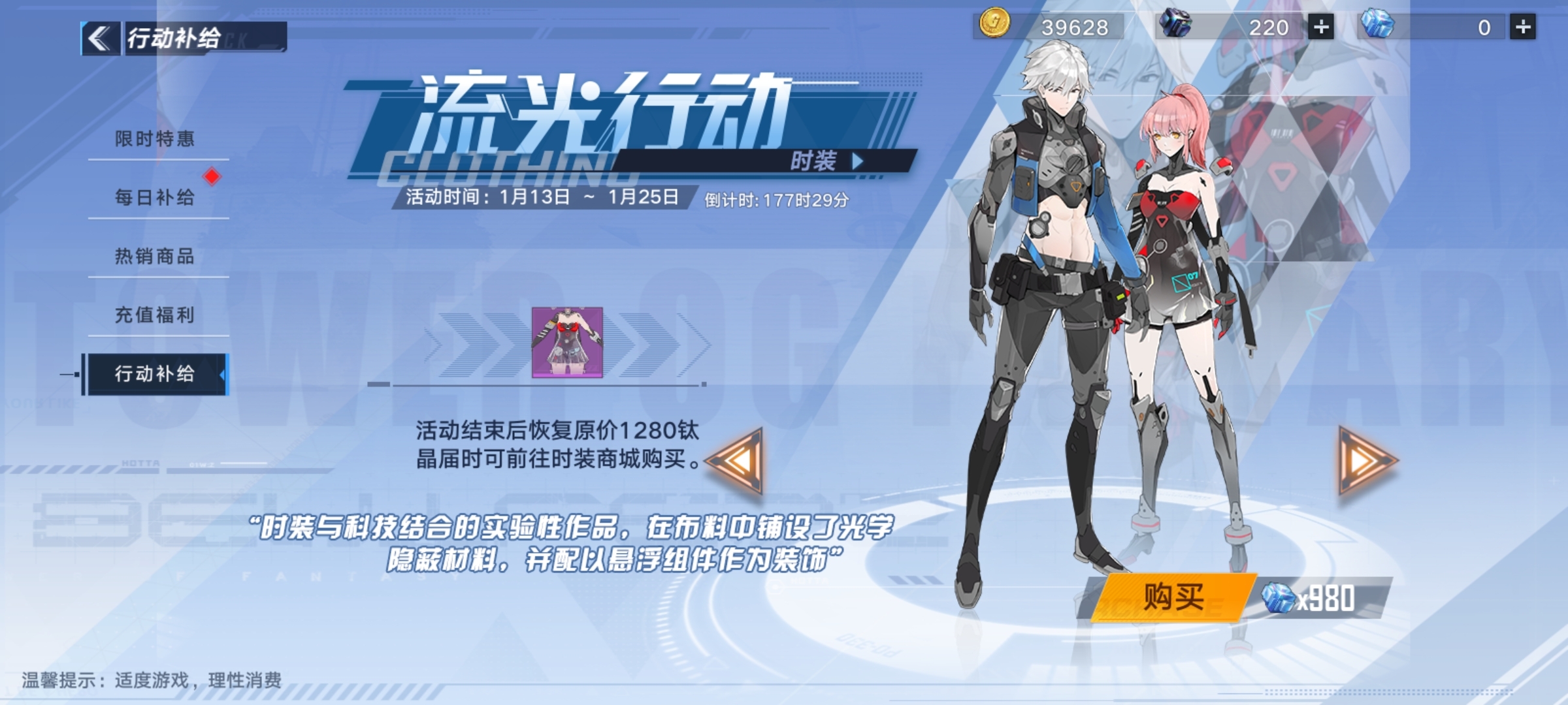 流光行动是三套新时装之一,在商城可以购买 ,目前是有折扣的,一直到一月二十五号