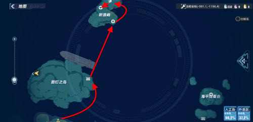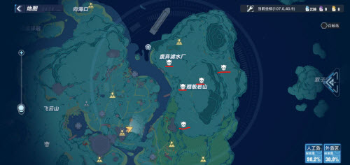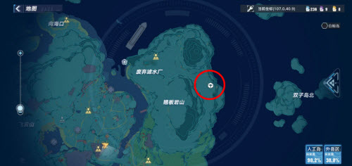 传送过来后,我们需要爬到下图对面的山顶上在山顶有一个集装箱,我们进去后拿到权限卡-蒂龙第一条红色线路走完了,接下来第二条黄色线路我们再来到起点传送到双子岛北,然后爬到山顶使用权限卡-蒂龙通过传送装置来到海平线看台在山顶上我们会看到这个装置,上面有权限卡-莫里斯接着我们来到图钉之岛的东边的传送装置,具体位置在下图宝箱标签处。