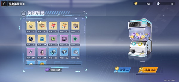 3.扭蛋机:分为普通扭蛋机和限定扭蛋机,用镜元抽的普通扭蛋机的奖励都是较常见的,用旧维拉币抽的限定扭蛋机好东西较多,有几率开出新载具零件。