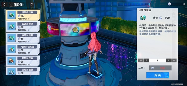 5.服务站:所以买到采集加速器,元素矿精炼等物资道具,可以快速的刷各种物品,但是每天限购一个。