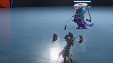 6、歌舞九天二段:歌者飞到空中,会以弧线冲向我们,我们只需要在他在弧线最右边时闪避触发幻时。