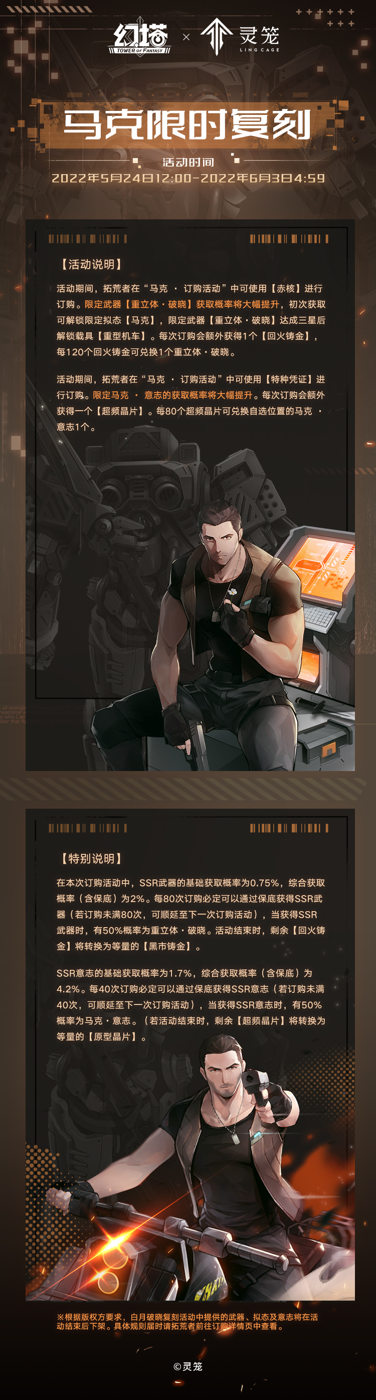 ◆活动期间,在“马克·复刻活动”中可使用【赤核】、【特种凭证】进行武器、意志订购。限定武器【重立体·破晓】及马克·意志的获取概率将大幅提升。 ◆根据版权方要求,白月破晓复刻活动中提供的武器、拟态及意志将在活动结束后下架。具体规则届时请拓荒者前往订购详情页中查看。