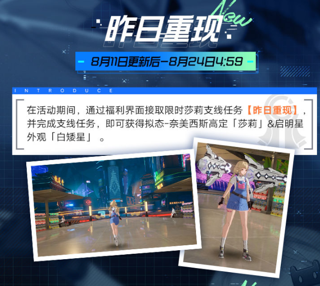 在活动期间,通过福利界面接取限时莎莉支线任务【昨日重现】﹐并完成支线任务,即可获得拟态-奈美西斯高定「莎莉」&启明星外观「白矮星」。