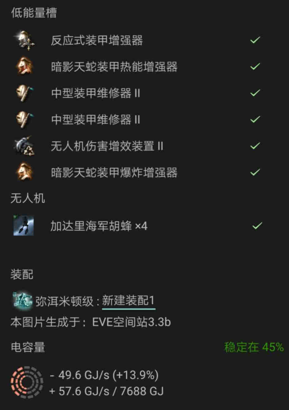低槽:反应式装甲增强器+2中型甲修+无人机伤害增效+热能增强和爆炸增强器。