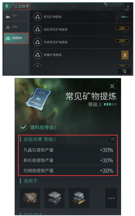 提炼矿物相关的技能位于工业技术的资源分页,以目前E酱的科技等级,通常只会在高安开采常见矿物,使用技能点将该技能点至3级,就可以提供30%的提炼加成。