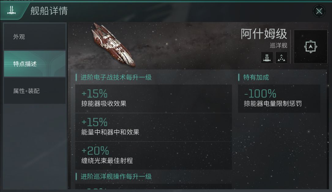 一些克隆飞行员可能忽视了阿什姆的作战能力,认为仅有5个高槽的阿什姆不具备极强的输出,他们没有注意到阿什姆的加成较为特殊,每一级进阶巡洋舰操作会提高12%的激光炮伤害,在5级的加成下高达60%!