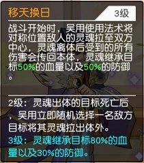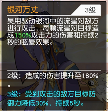 吴用特点就是拉魂,拉出的魂只有50%的血量和防御,这个技能很牛的,可以理解为减少了对方一名英雄一半的防御或者我方对被拉魂的敌人攻击翻倍,优势很明显,大招全屏攻击附加眩晕效果和减防御,无论在PVE还是PVP都有稳定的位置。