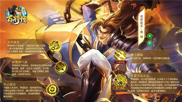 在游戏中,樊瑞是黑桃阵营的智力型英雄,能通过消耗自身血量,对最近的敌人甩出流星锤或发射一道可穿透的激雷,造成大量伤害,并附加“雷噬”效果(每秒造成一定真实伤害,最多可叠加数层)。
