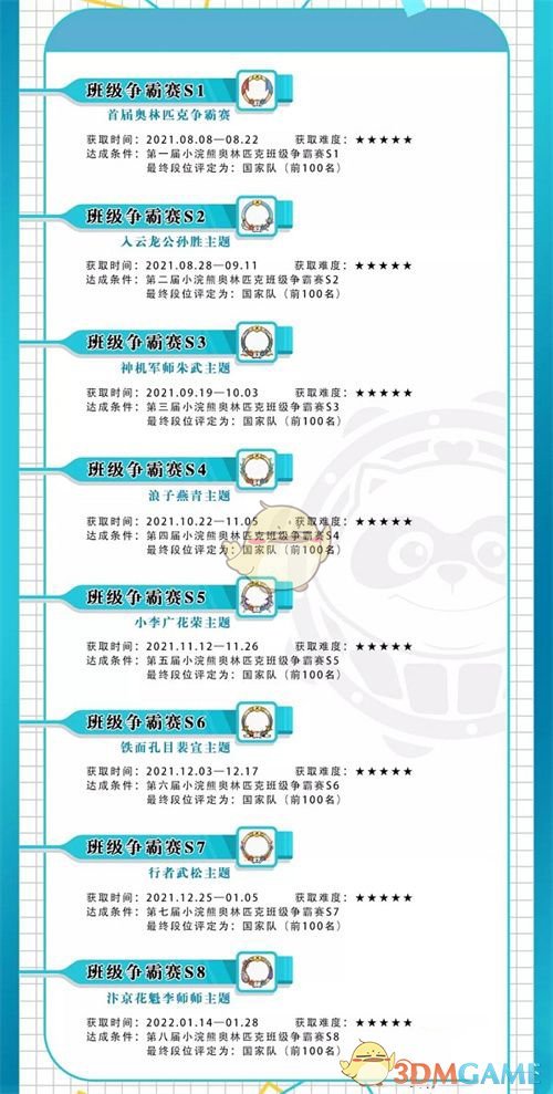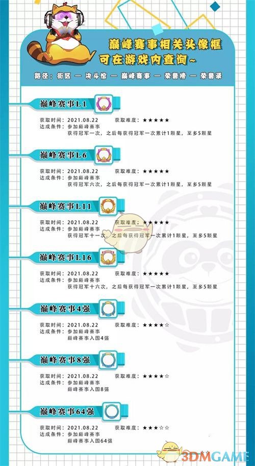 1、头像框获得方法就如上面图示内容,例如巅峰赛事64强头像框获取时间为:2021.08.22,获取难度为3颗星,达成条件为参加巅峰赛事,巅峰赛事入围64强。