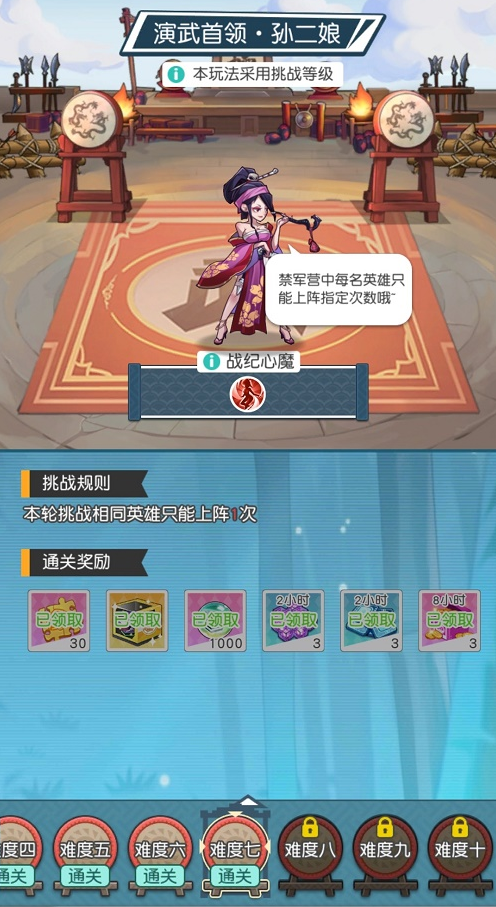 2、敌方英雄(神话童贯、神话孙二娘)VS我方英雄(神话杨志、神话柴进),站位:杨志1号位、柴进3号位(正常输出)应对关卡难度:★★,一次性过关几率:99%。